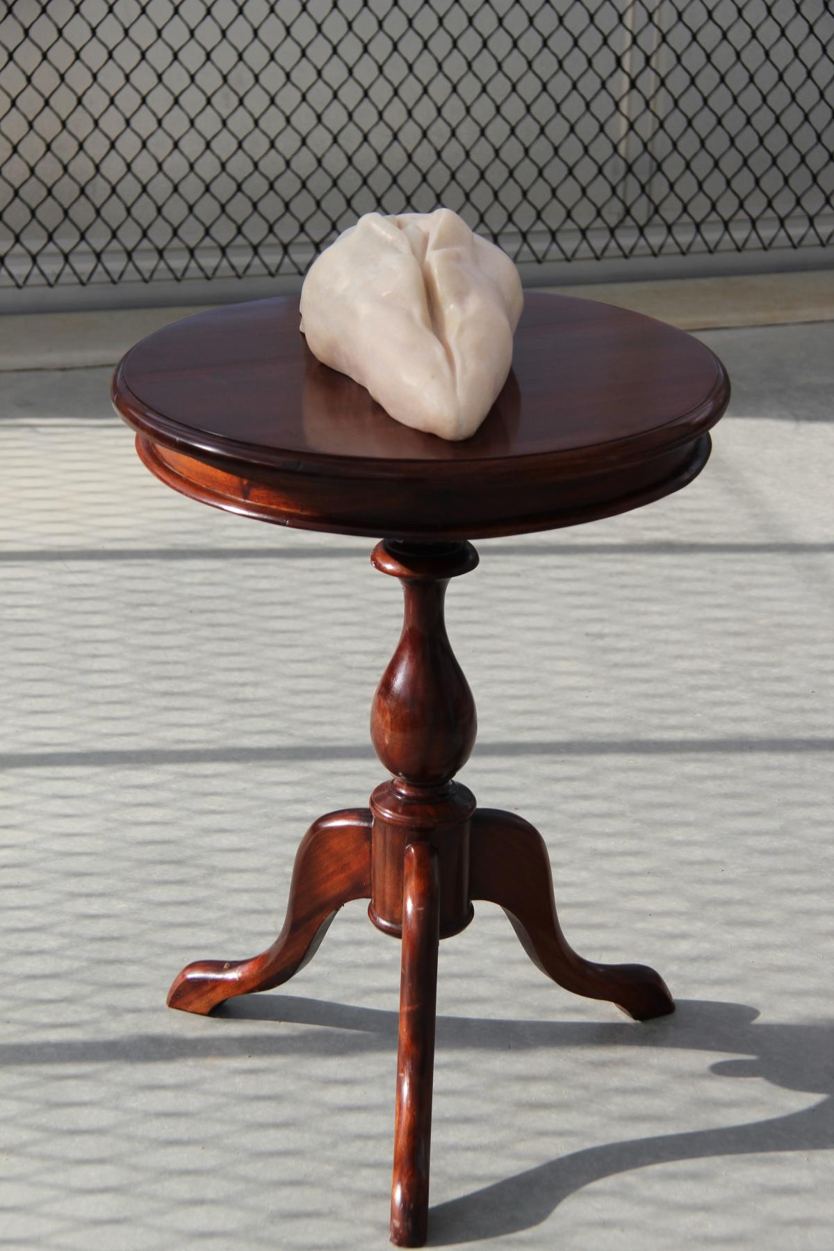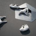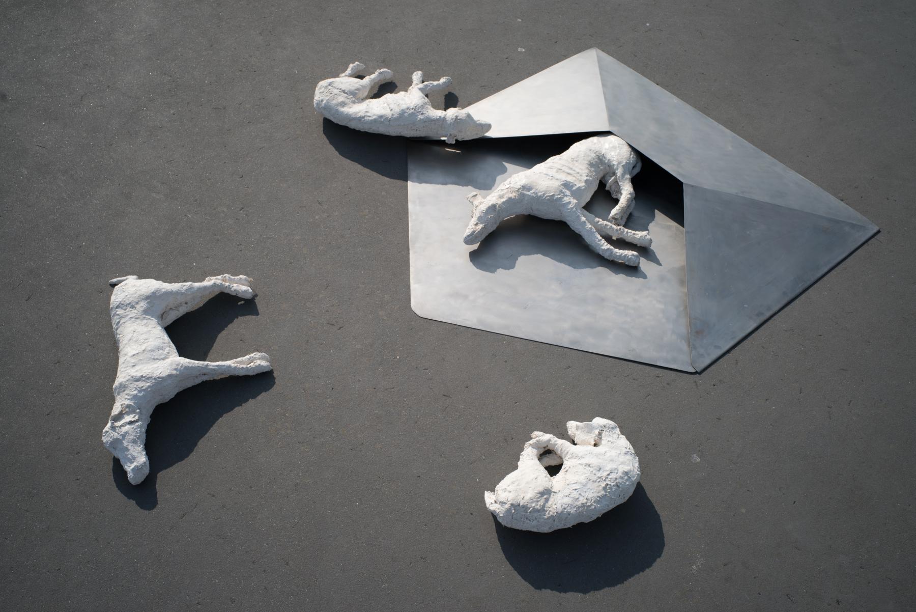 In her visual language Caroline often uses symbols such as engorged veins, dead dogs or kidney-shaped dishes. These sometimes-enigmatic elements give her work a surreal atmosphere. In the execution of her ideas she uses materials as diverse as natural resin, clay, flax, artificial resin, wool, lead, plaster, glass, bronze and stone.