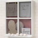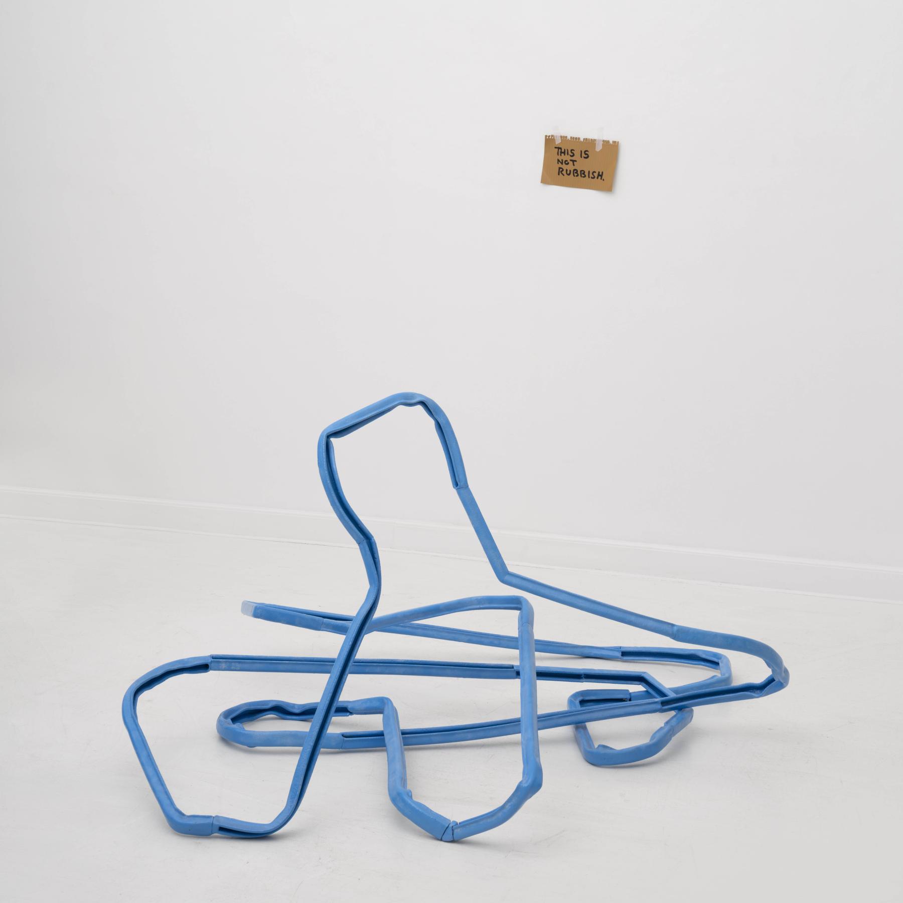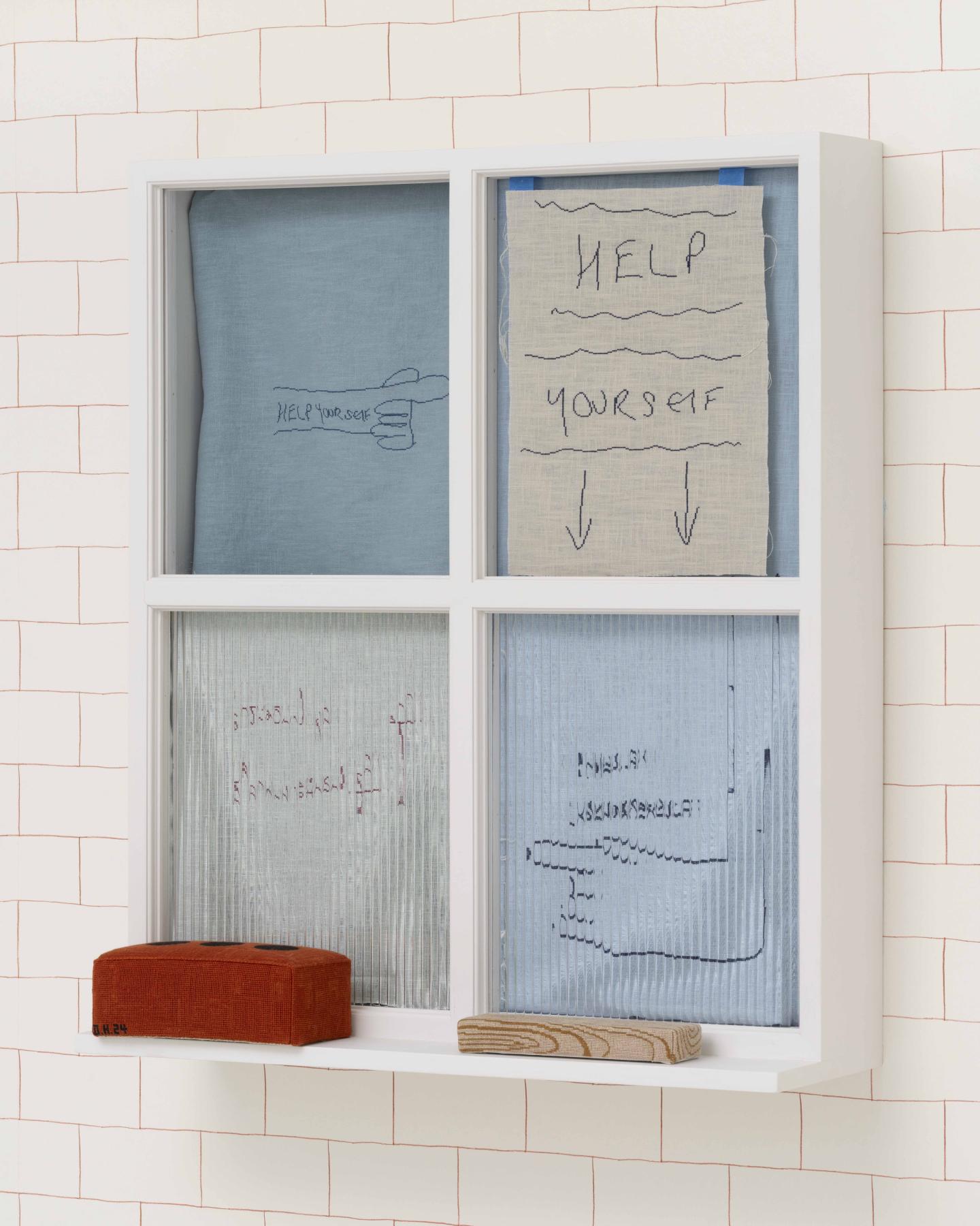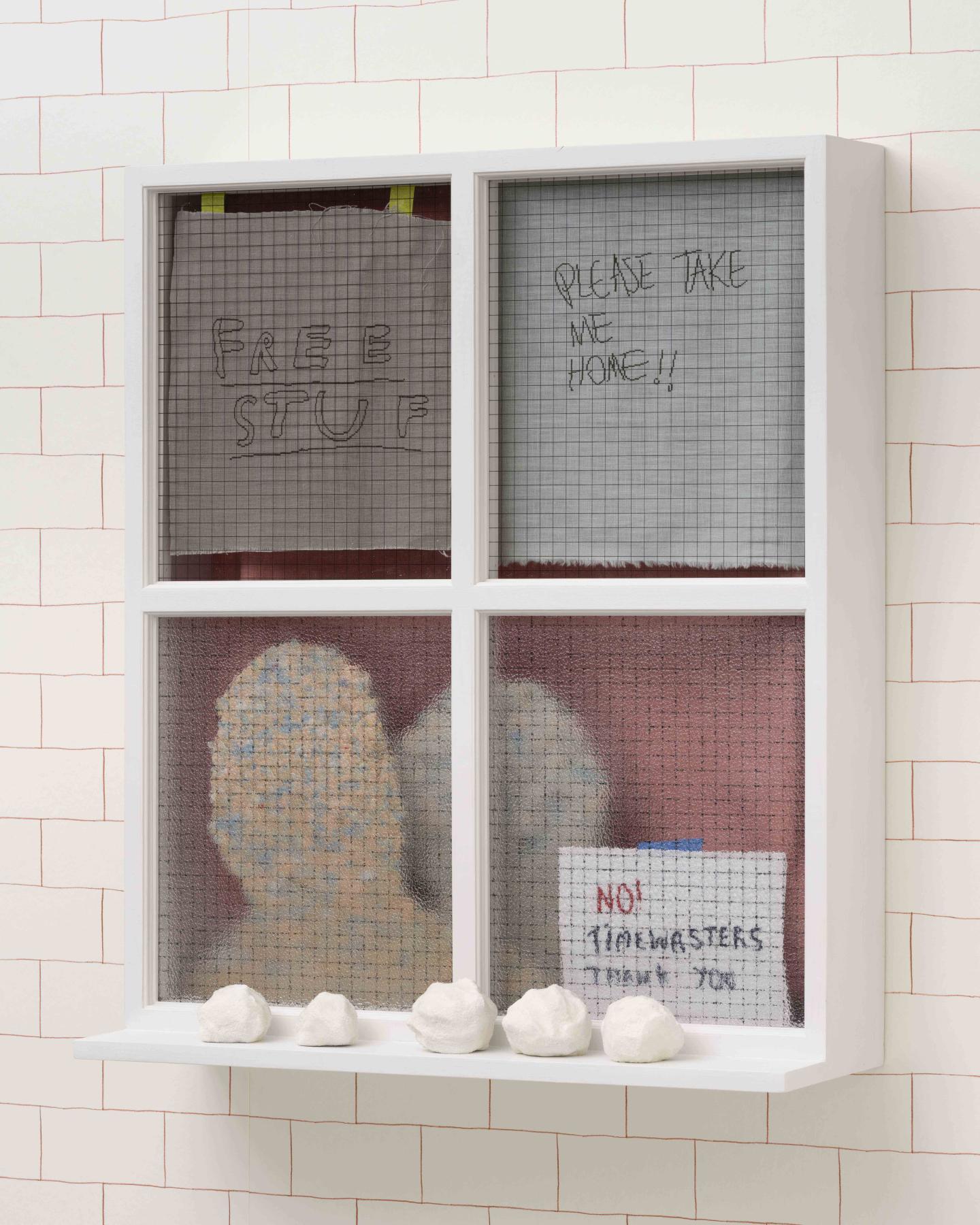Hughes’ works are circumstantial. Fascinated with the material world of objects, the work is an amalgamation of the environment he comes into contact with. His magpie mentality means his work extends beyond the material to draw ideas from places, such as hand made signs seen in windows and old stepladders, proving that nothing is off limits. It can take years for categories, patterns and connections to realise themselves into a body or individual work. Hughes approaches all aspects of his process with care and dedication; collecting, stacking and piling are treated equally to the casting process that involves multiple hands. Through perverse humour, Hughes’ democratisation of material, space and category asks us to question the hierarchies we have placed on them. His cross-stitch work exhibits tension between the dynamism of the quickly drawn scribble and the restraint and measure it takes to stitch.