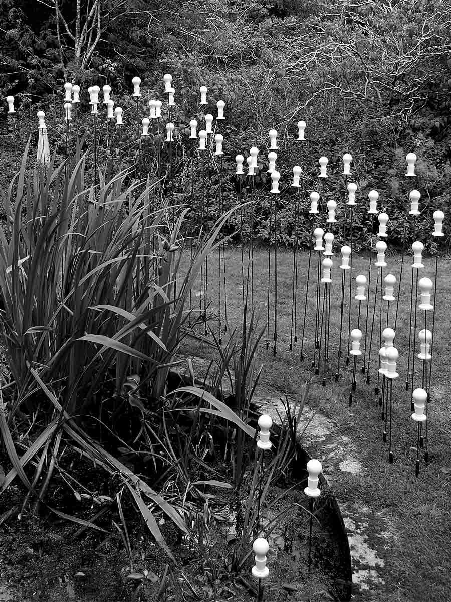 Their first major public installations were seen throughout 1992-97 with large scale fabric sculptures for the Bar 38 chain, followed by the highly influential Harvey Nichols ‘Food and Fashion’ installation at the flagship Knightsbridge store in 2001; the Cow Parade and BT ARTBOX followed in 2002 and 2012 with the proceeds of both gala auctions going to ChildLine. The London launch of the Dot To Dot initiative was city-wide in 2016; ‘The Sculpture Shack’ was installed at Chelsea Arts Club throughout 2017-18, the London Festival of Architecture ‘Tribute to Mary Shelley’ in 2018, ‘Beauty VS the US Machine’ found a home at the Cotswold Sculpture Park 2021 as well as being used to illustrate the escape from mental illness at a major symposium in the USA. Throughout 2025 Sculpture@The Grove, Bayfield Hall Sculpture Trail and the Gas Works Museum Trust in Norfolk all saw more intimate site-specific installations and towards the end of the year the duo created the nation-wide Christmas windows for the Mulberry chain. In early 2026 ‘Seeds Of Ideas//Ghostlight’ [previously exhibited at Bayfield Hall] was installed at the Himalayan Garden and Sculpture Park in North Yorkshire.