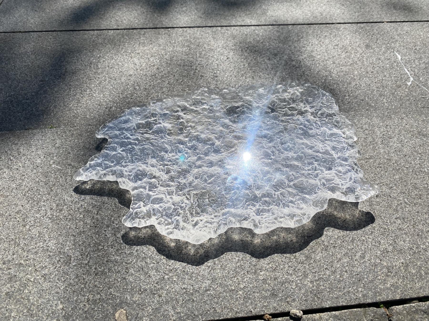 A thread that links her works is the examination of our relationship with screens and their integral relationship with glass: sometimes utilising glass’s unique relationship with light, sometimes posing the question ‘how does this align with digital technology’, particularly in the breakdown of colour, and sometimes using glass’s qualities to replicate and explore screens that occur in nature. By shifting materiality in these ways, her work can hold on to moments that are otherwise lost or unseen, opening up a virtual elsewhere as well as a virtual elsewhen.