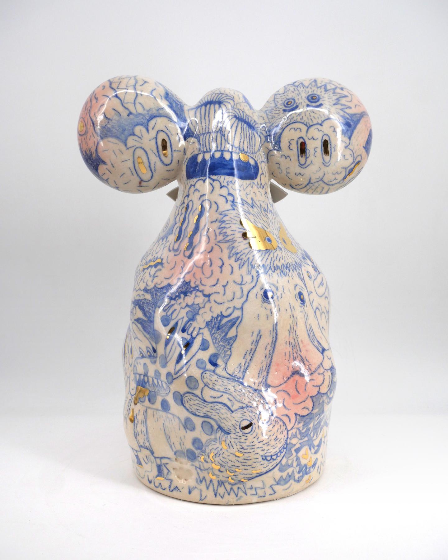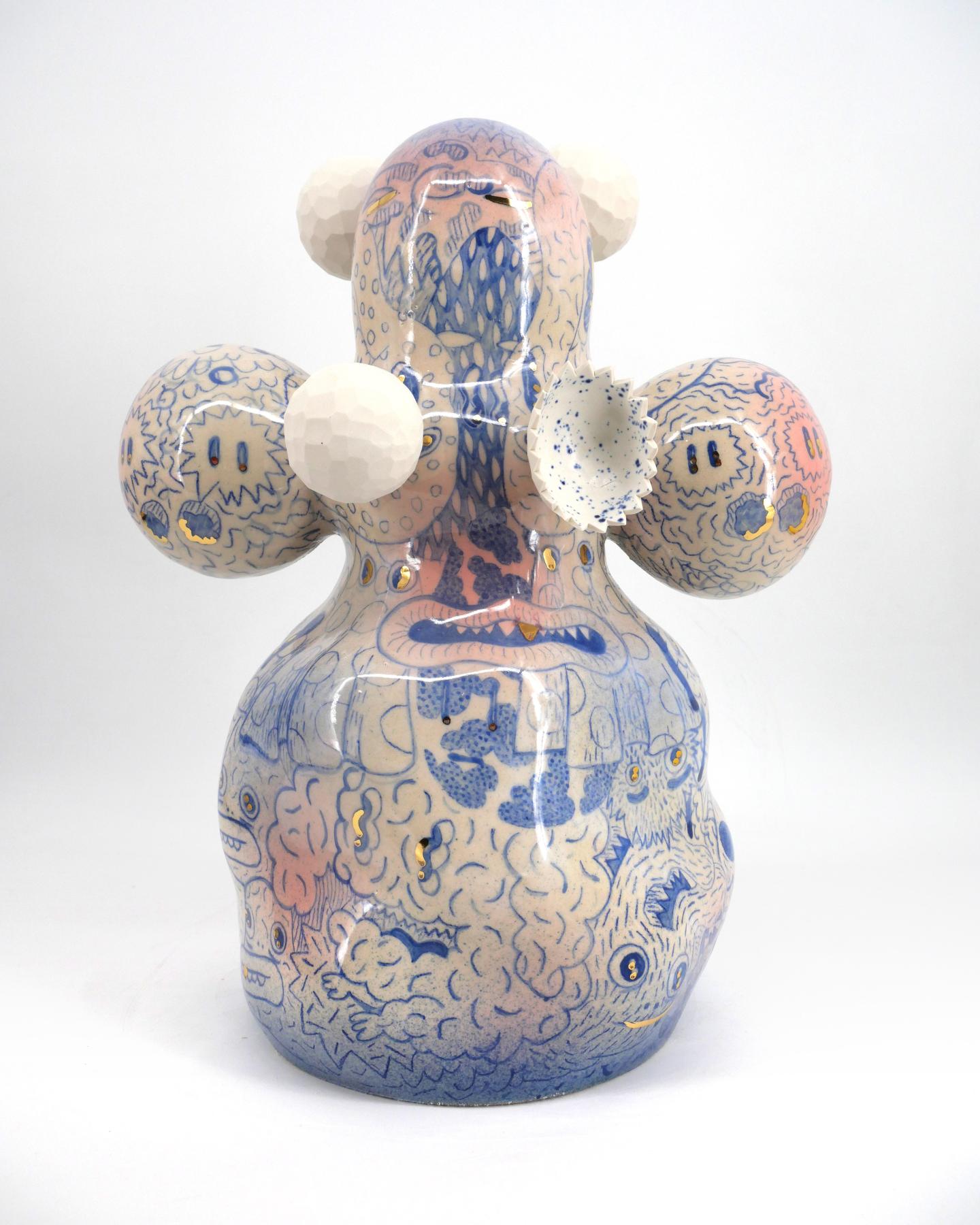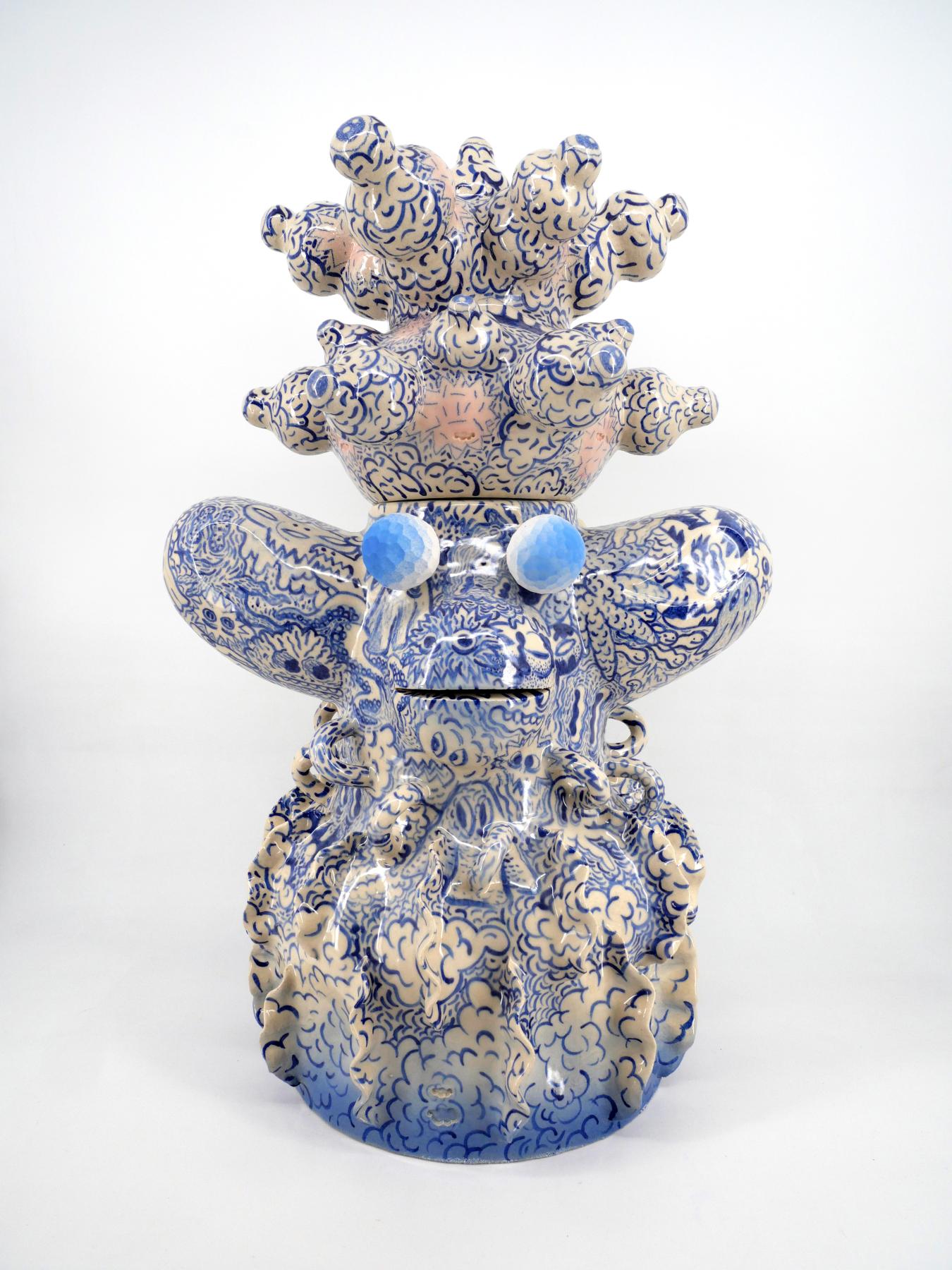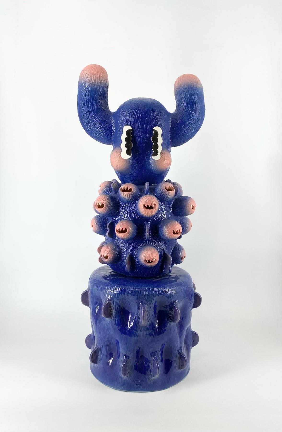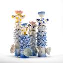 Kartini Thomas draws on her background in biology and a fascination with monsters and modular toys to create playful, immersive landscapes inhabited by creatures that are at once endearing and unsettling. Her sculptural forms—both meticulously crafted and intuitively assembled—explore themes of biodiversity, monstrosity, and otherness. Each piece is fired up to five times at varying temperatures, resulting in rich, layered textures and vibrant colours.