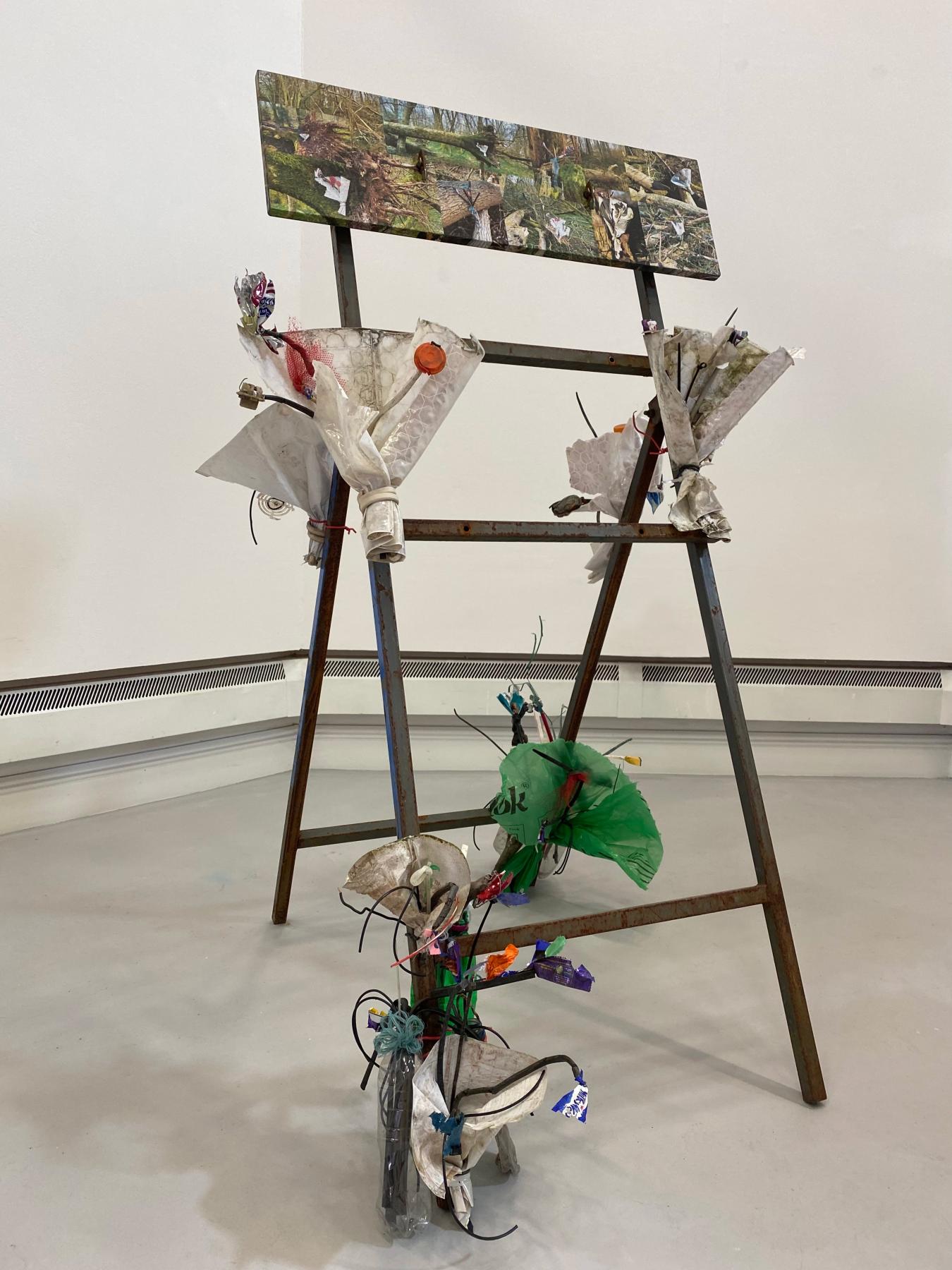 Liz Clifford uses daily walking as the starting point for her work across drawing and sculpture. She aims for a sustainable practice through the use of salvaged materials, many of which are found littering the countryside - the detritus of agri-business, transport, recreation and family life. She responds to these materials by building assemblages, employing low-tech methods of construction such as knotting and binding, referencing the ‘making do’ solutions that evolve with circumstances and are associated with ‘fixing things’ in both domestic and agricultural contexts. As well as addressing concerns around pollution, the works explore assemblage as a post-human hybrid concept. A coming together of objects with their own agency to create new beings, with the accidental playing a hugely important role. Time is also a key feature, from the duration of the repetitive walk to the slow gathering of materials and the incorporation of live flora in the work.