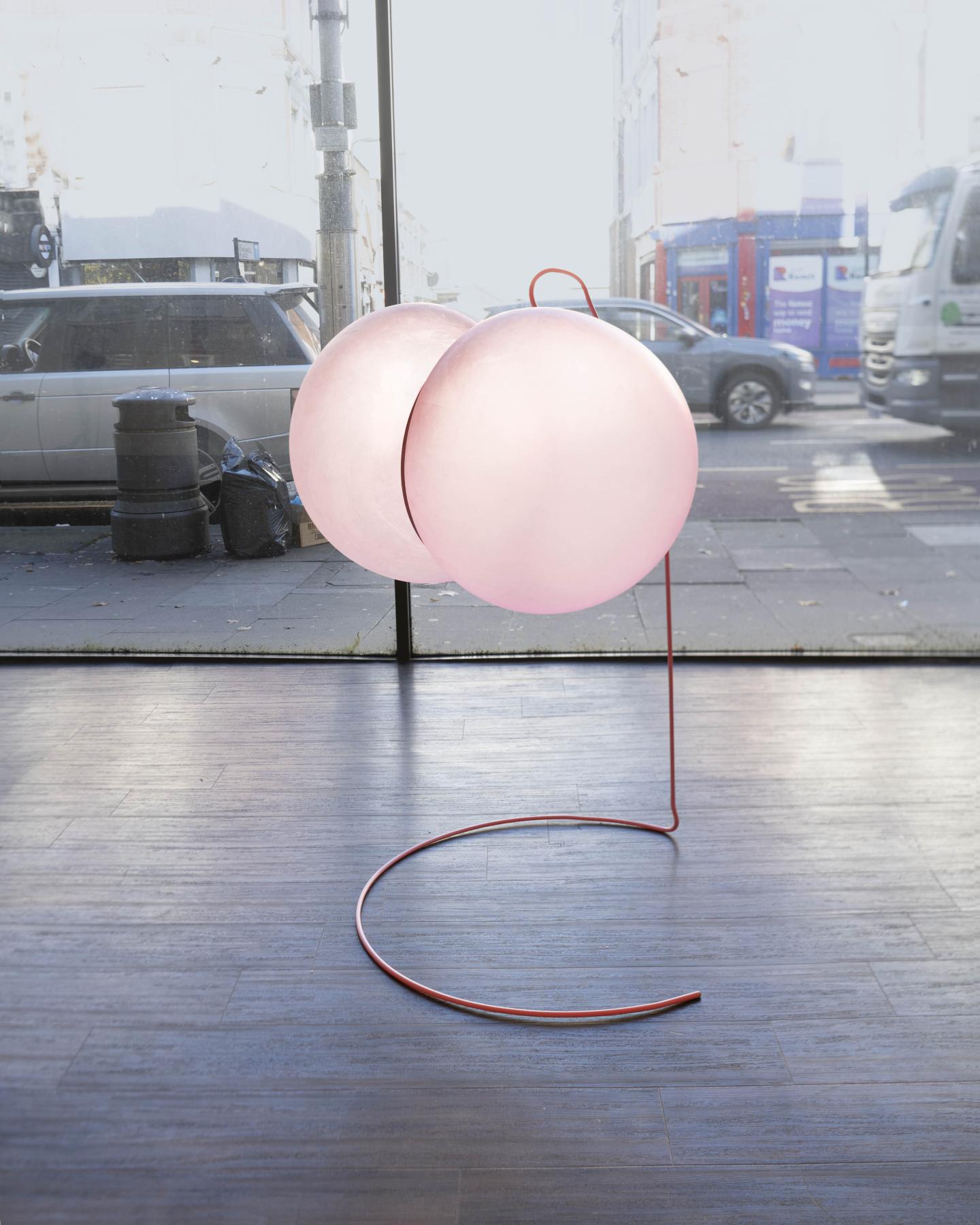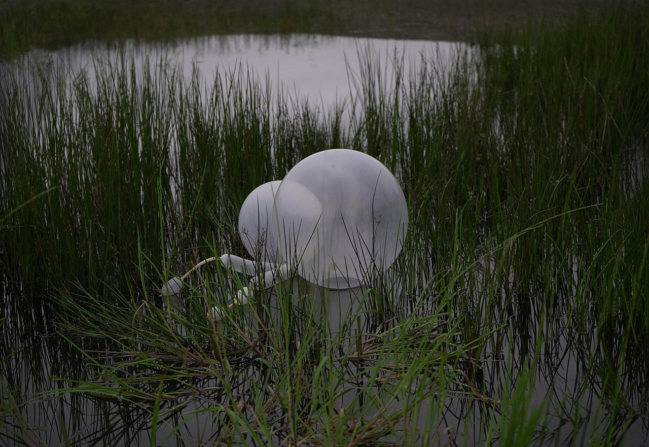 The physical stability of the objects is dependent on a delicate balance between the inner and outer pressure of gossamer skins. Reacting to subtle environmental changes, their swollen buoyancy hints at imminent collapse. Orbs that dangle or wobble precariously on skeletal structures may appear as a parody of entrails or comedic characters. When situated in a landscape, they can present as alien fruits or topiary.