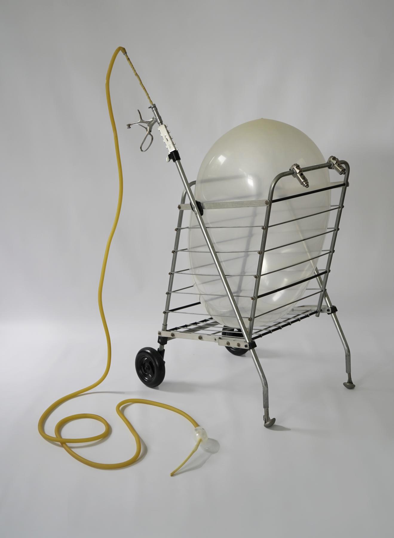 Conflicted about occupying space or adding to a crowded world Dillon builds transient forms using inflatables or organic substances. The incorporation of discarded medical and laboratory instruments suggests the fragile symbiosis between human-made and natural materials.