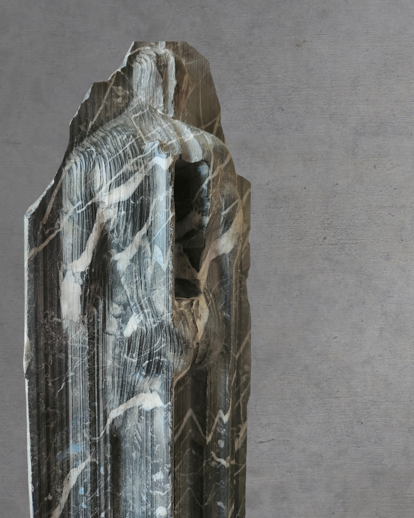 To articulate this process, I have developed a 'grammar of repair'. This methodology is both a physical act and an ethical stance. It originates from a direct engagement with trauma—notably the "anthropological cancellation" of the Belice territory in Sicily following the 1968 earthquake —and translates the civic act of architectural reconstruction into a personal, sculptural language. The suturing of fractured, salvaged marble with thread or metal is its most visible syntax. This act does not seek to erase the wound but to transform it into a structural and visible bond, a scar that testifies to a history of rupture and resilience. This grammar is further articulated in the dialogue between the precision of robotic milling and the intimacy of hand-finishing, an embodiment of the tension between systemic forces and individual agency.
