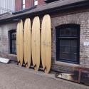 The sculpture consists of a row of four wooden longboard surfboards featuring a scaled drawing mapping the world’s remaining tropical coral reefs printed right across their middle section. Positioned vertically, they stand sentinel against a wall of the historic Proving House at Trinity Buoy Wharf.